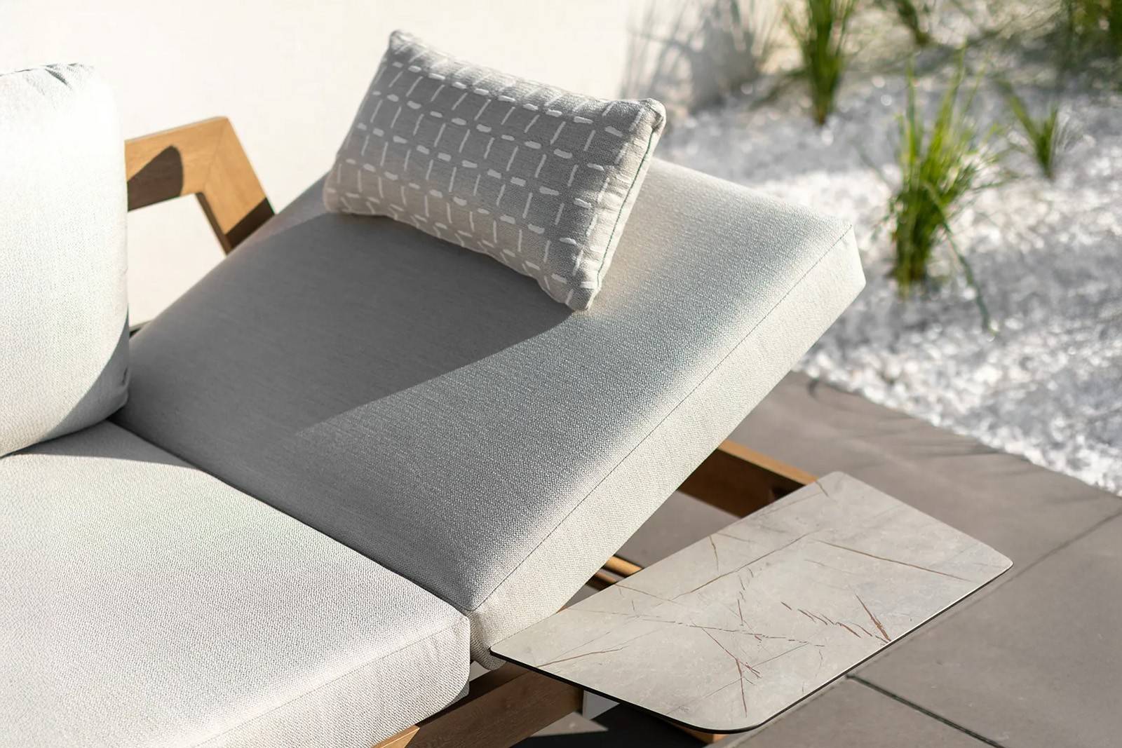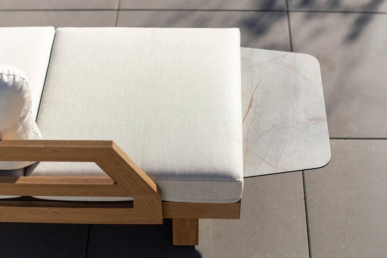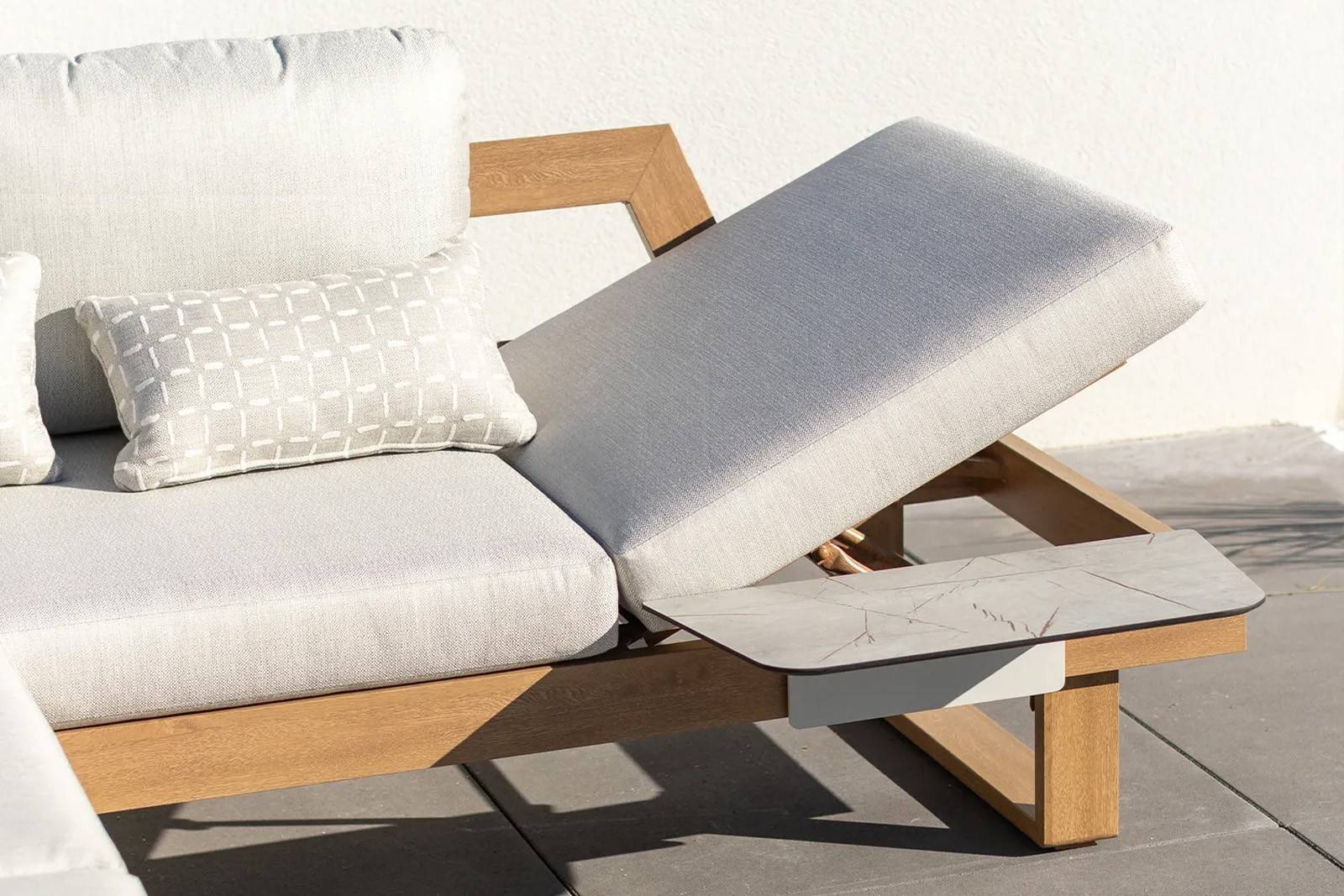 Geometrické linie pohovek v kombinaci s jemnými tvary stolků Lounge vytvářejí stylový a harmonický celek. Konstrukce z práškově lakovaného hliníku v dekoru dubového dřeva dodává nábytku hřejivý charakter a prémiový vzhled. Elegantní desky stolků navíc podtrhují exkluzivní styl celé sestavy.