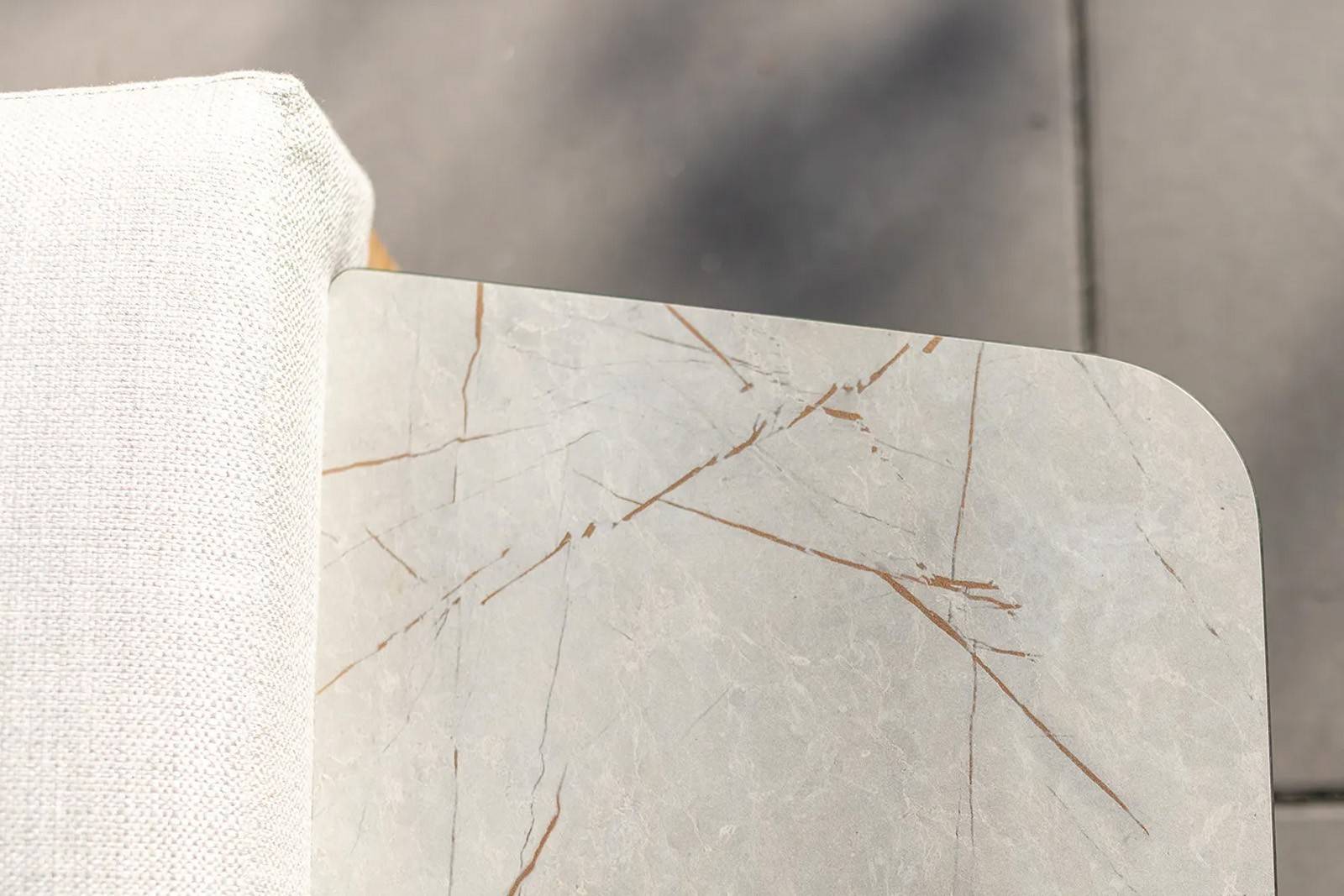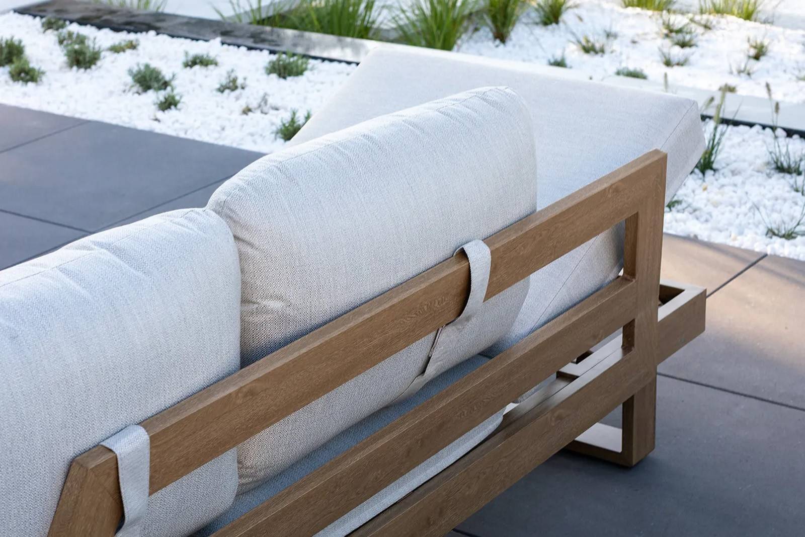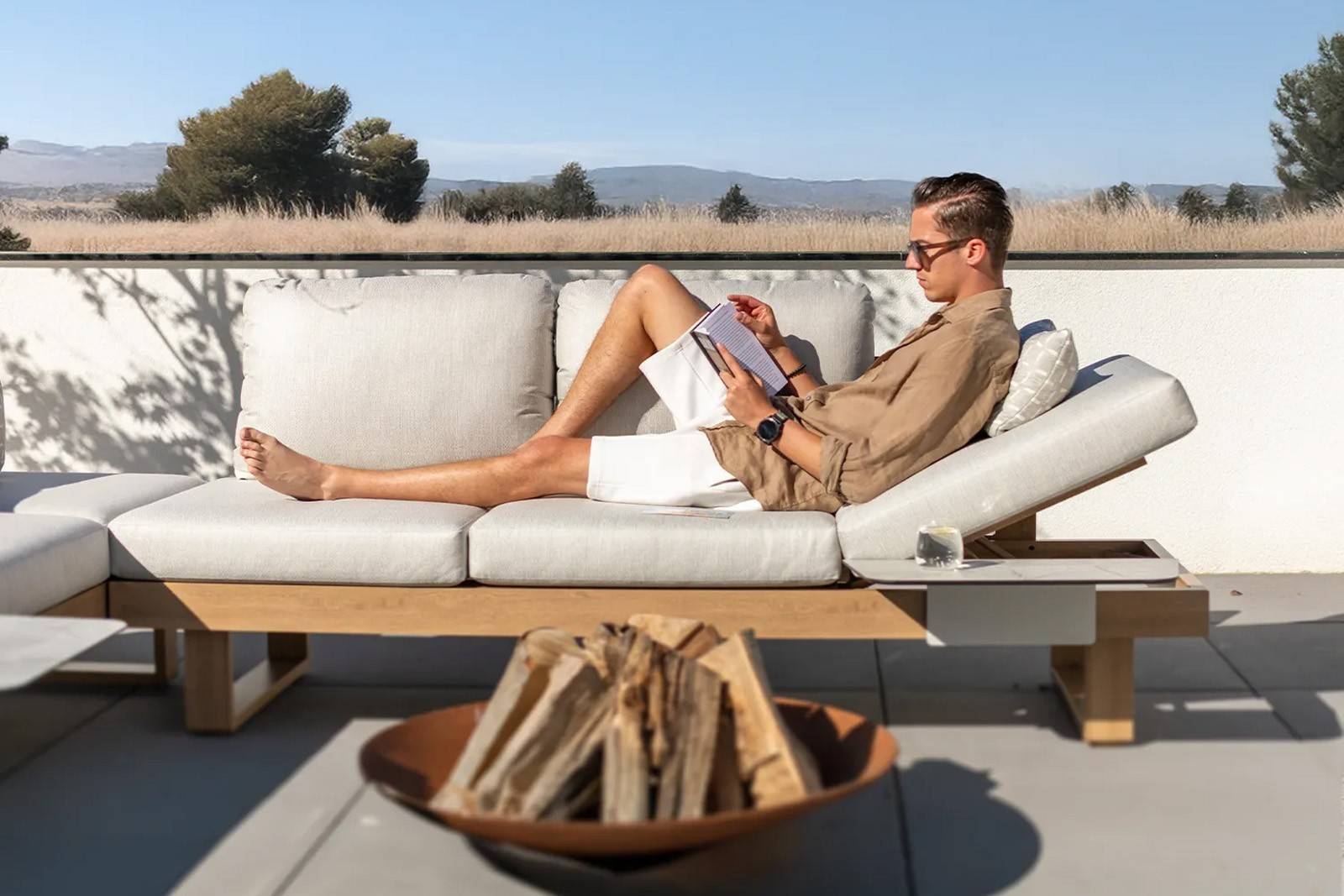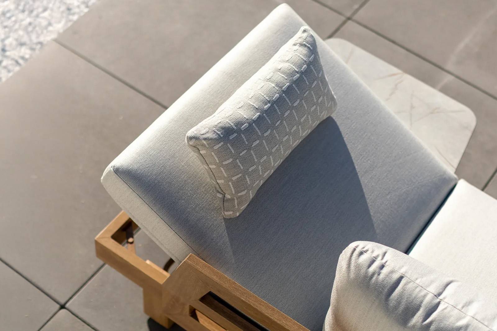 Geometrické linie pohovek v kombinaci s jemnými tvary stolků Lounge vytvářejí stylový a harmonický celek. Konstrukce z práškově lakovaného hliníku v dekoru dubového dřeva dodává nábytku hřejivý charakter a prémiový vzhled. Elegantní desky stolků navíc podtrhují exkluzivní styl celé sestavy.
